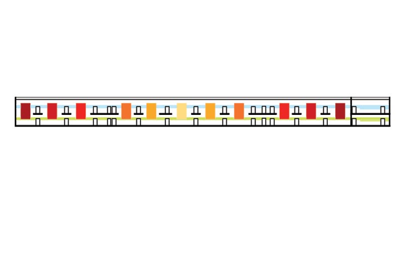 Zwei Friese bringen das Blau des Sees, des Himmels und das Grün der umgebenden Wiesen und Wälder in die transparent gehaltene Architektur. Die gelb-orange-roten Rechtecke spiegeln nicht nur die Sonne, sondern dienen auch der Orientierung der Schüler und Lehrer.