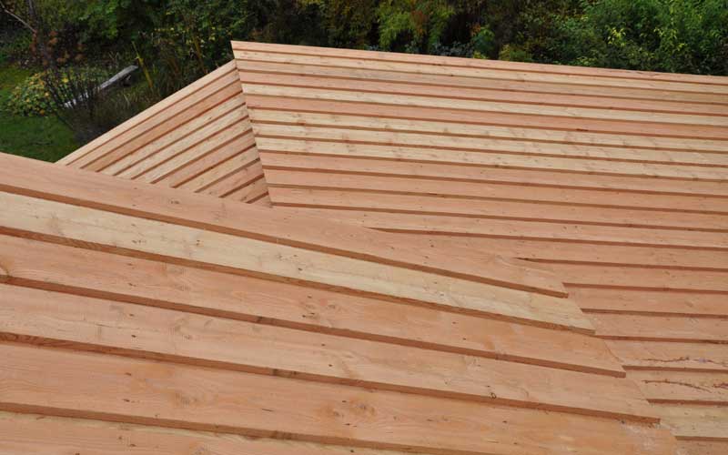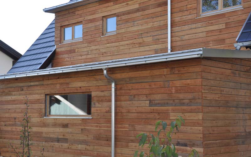 Das Lärchenholzdach mit seinen klaren Linien und dem lebendigen Material verleiht dem ehemaligen Waschhaus ein extravagantes Aussehen.