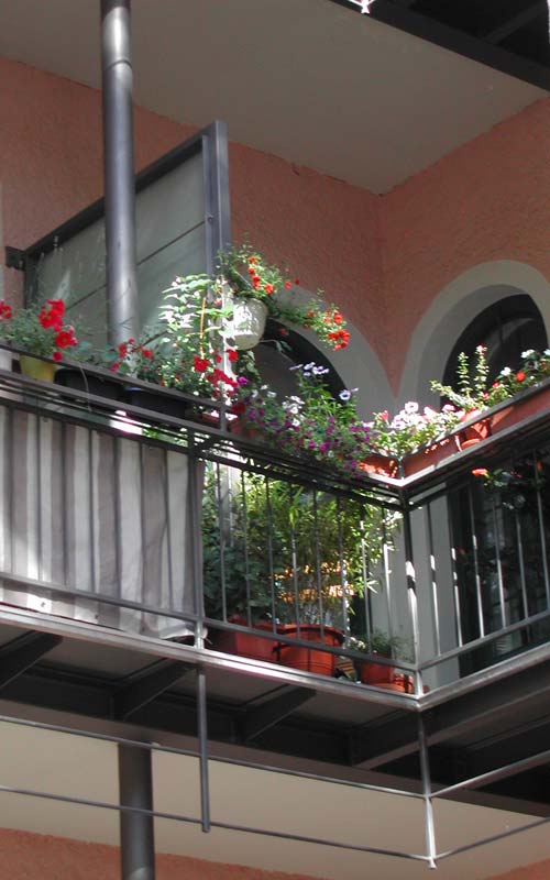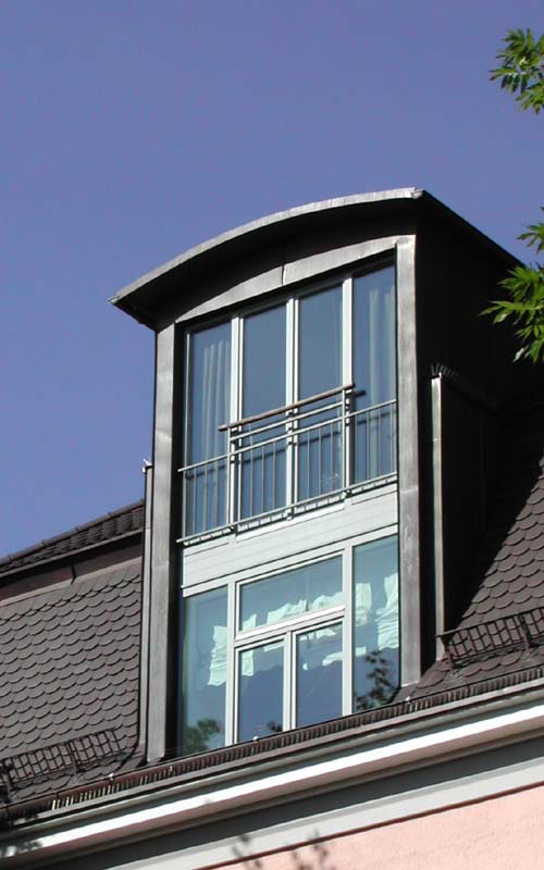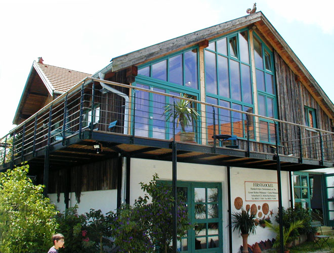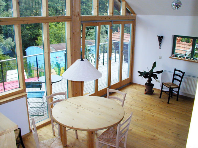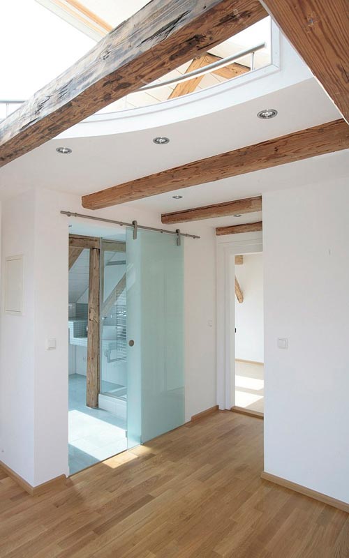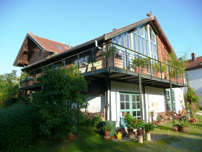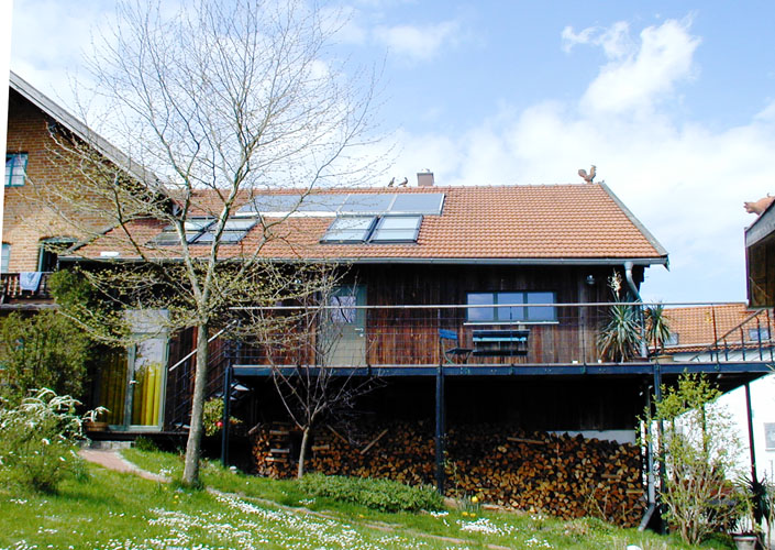 Durch den Ausbau der Tenne entstand eine außergewöhnliche Split-Level-Wohnung in Niedrigenergiestandard. Großzügige Verglasung und umlaufender Stahlbalkon.